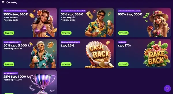 | Sunday Reload Bonus | 25% match έως €100 | Κάντε reload στο υπόλοιπό σας την Κυριακή και κάντε claim από τη σελίδα Προωθήσεων |