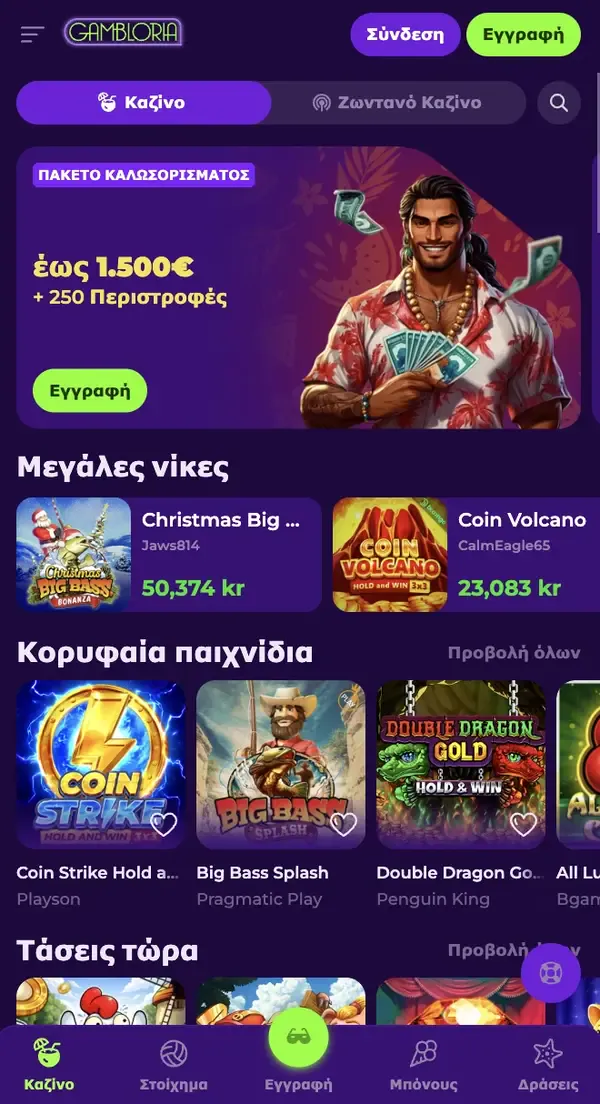 Μετά την εγγραφή, μπορείτε να χρηματοδοτήσετε τον λογαριασμό σας και να εξερευνήσετε τις τρέχουσες προσφορές, συμπεριλαμβανομένων εβδομαδιαίων και εποχικών ενεργειών. Οι τρέχουσες προσφορές για την Ελλάδα περιλαμβάνουν εβδομαδιαίο Newbie Spins Lottery με pool €2,500 σε δωρεάν περιστροφές, High-Roller Bonus (50% έως €500 + 50 δωρεάν περιστροφές) και Sunday Reload Bonus (25% έως €100). Αν σας αρέσει ο ανταγωνισμός, τρέχουμε επίσης τουρνουά όπως Live Tournament (pool επάθλων €10,000), Rookie Rumble (€2,500) και Sparkling Spins (€85,000). Όταν προτιμάτε εγκατεστημένη πρόσβαση, η εφαρμογή Gambloria κρατά αυτές τις προωθήσεις εύκολες στον εντοπισμό, και το ίδιο ισχύει μέσα στο mobile παιχνίδι μέσω browser στο καζίνο Gambloria.